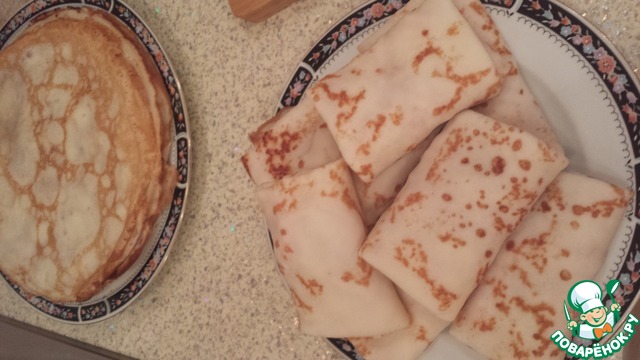 | Самые вкусные блины- бабушки... Но если дома ее нет, то можно попробовать накормить детей самому. Начинку можно использовать любую, на данный момент под рукой оказался бекон и сыр... |