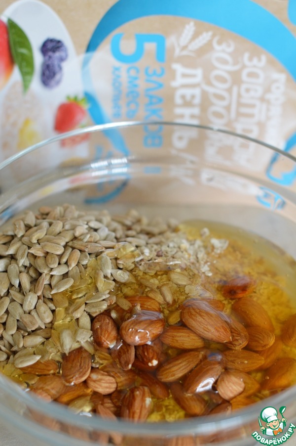 2. Добавить миндаль и семечки. Влить масло и мед.