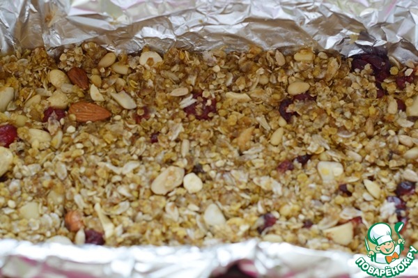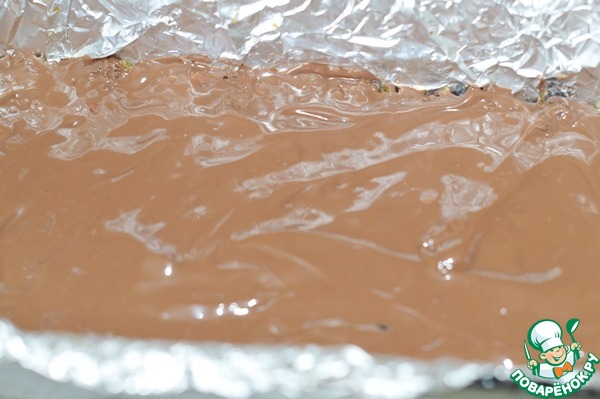 6. Поставить форму в холодильник на несколько часов. Затем растопить шоколад и смазать наши будущие батончики. Когда шоколад застынет, вынуть из формы и нарезать полосками.