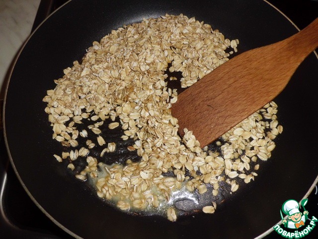 На сковороде, на среднем огне, с добавлением сливочного масла обжариваем хлопья от "Мистраль". Они должны получится сухими и хрустящими, не передержите.