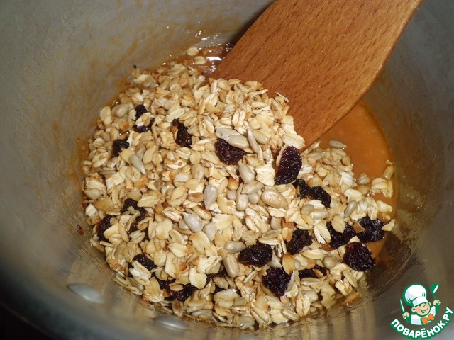 Выкладываем семечки, хлопья и нарезанный изюм (у меня был очень крупный) в отдельную посуду.