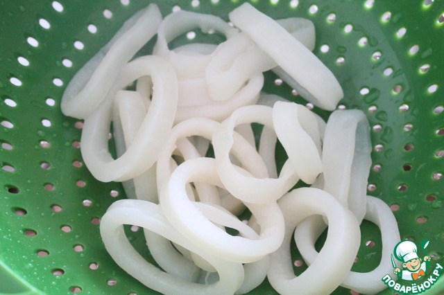 Кальмары, я использовала кольца, опускаем в кипящую воду на 2 мин. Смываем под холодной водой.