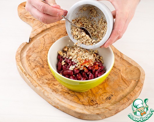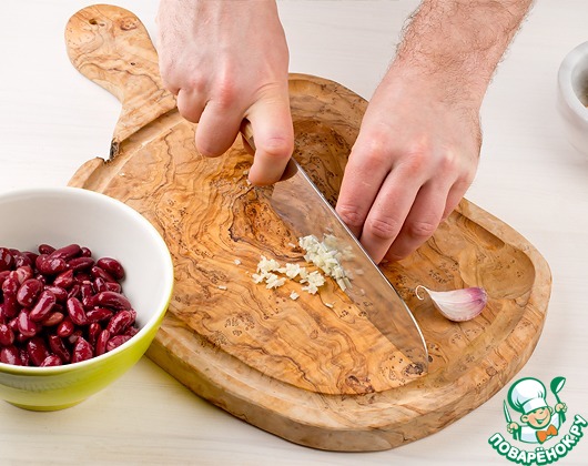 Консервированную фасоль процедить, выложить в глубокую миску, добавить измельченный чеснок.