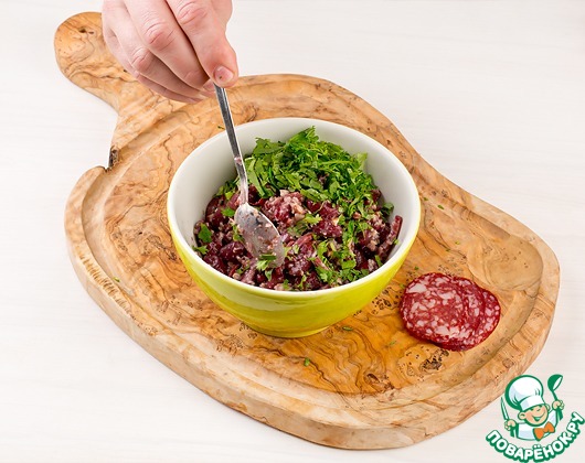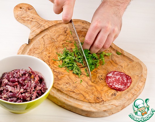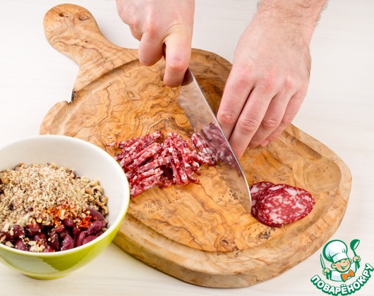Колбасу сырокопченую «Брауншвейгская черкизовская» тонко нарезать кусочками, далее соломкой, смешать с подготовленным лобио, оставив 3 кусочка на оформление.