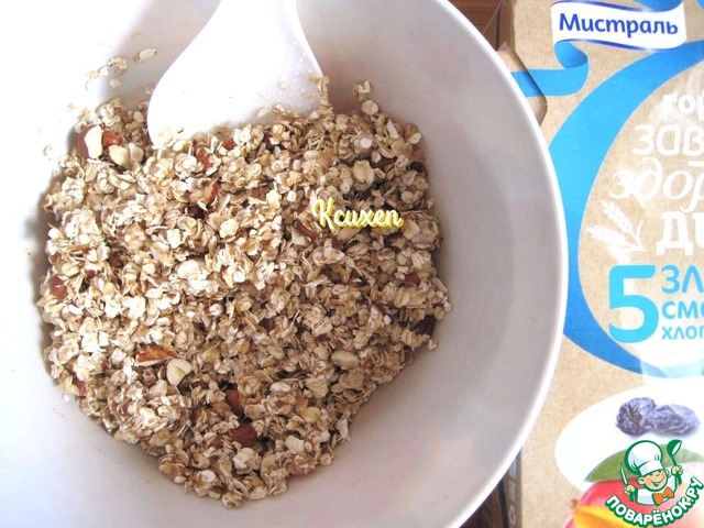 Сначала нужно приготовить и остудить гранолу. Всё очень просто и быстро. Не верите? Проверяем! У меня в запасе есть экспресс-рецепт простой гранолы 12-ти-минутной готовности в мультиварке. Для гранолы смешиваем хлопья "5 Злаков" от ТМ Мистраль, орехи, предварительно порубленные ножом и кленовый сироп.