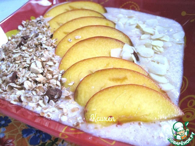 Сервируем: в глубокую тарелку или пиалочку наливаем смузи. По центру выкладываем ломтики персика, с одной стороны от персика выкладываем уже остывшую гранолу, с другой стороны-присыпаем миндальными лепестками.