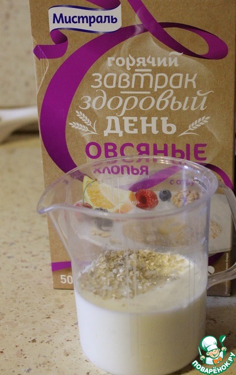 Кефир подогреть до очень теплого состояния. Добавить к нему хлопья, сахарную пудру 1 ст. л. перемешать и оставить на 15 минут при комнатной температуре.