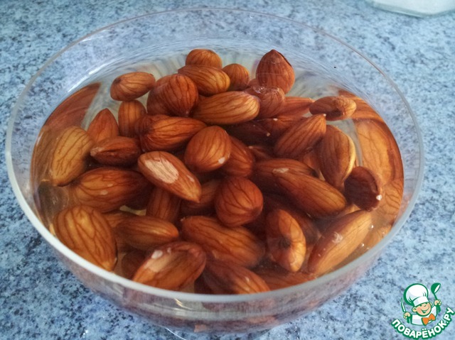 Миндаль заливаем кипятком, чтобы потом легче было очищать.