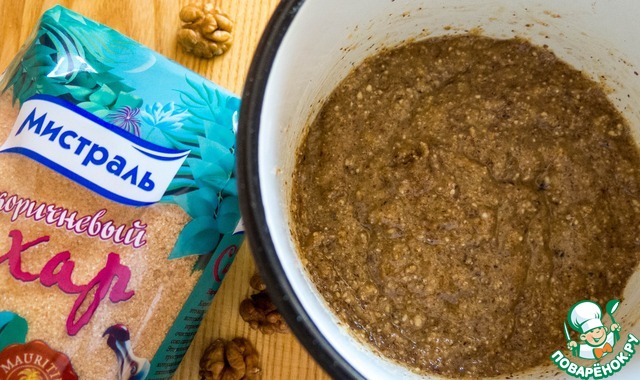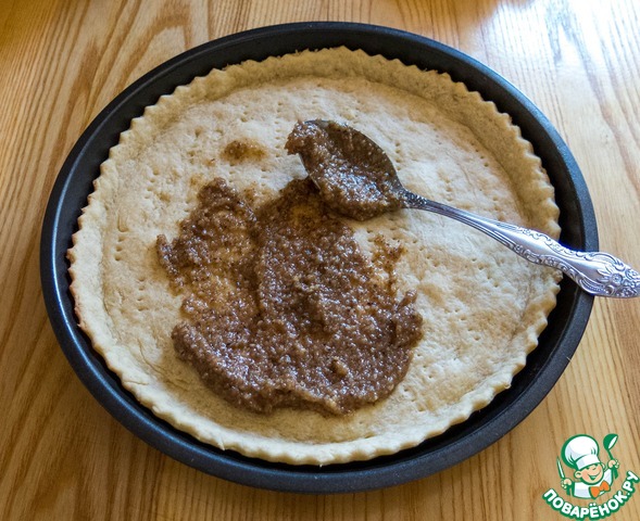 Тем временем наша основа готова. Достаем её из духовки и выкладываем на неё равномерно "ореховую пасту".