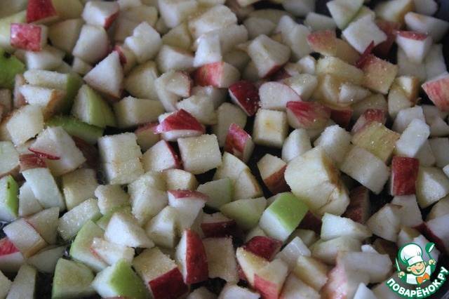 Выкладываем яблоки на сковородку, посыпаем сахаром и обжариваем на медленном огне. Яблочки равномерно пропитываются сахарным сиропом и карамелизуются, на мой вкус, так лучше, чем сырые с сахаром.