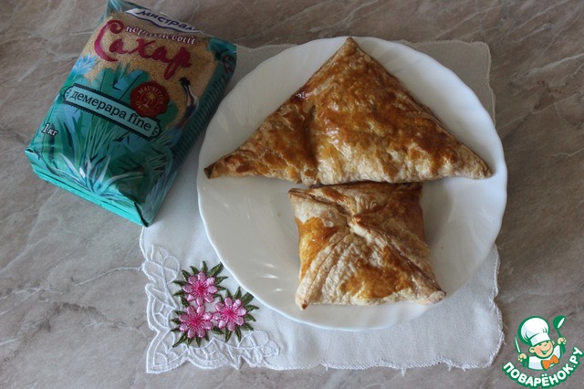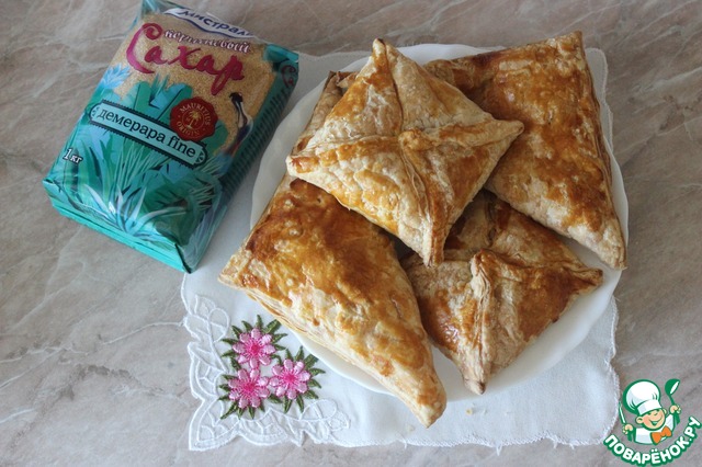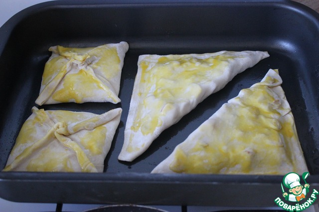 Раскатываем тесто, разрезаем на квадраты, выкладываем начинку, края смазываем взбитым яйцом. Треугольники начинены яблоками с изюмом, а конвертики только яблоками.