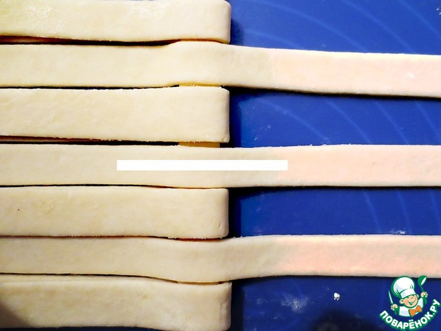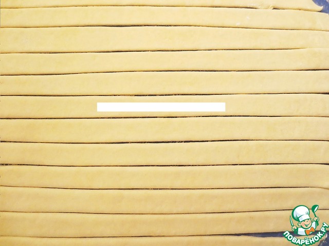 Раскатать тесто, ножом для пиццы разрезать на полоски, шириной 1 см.