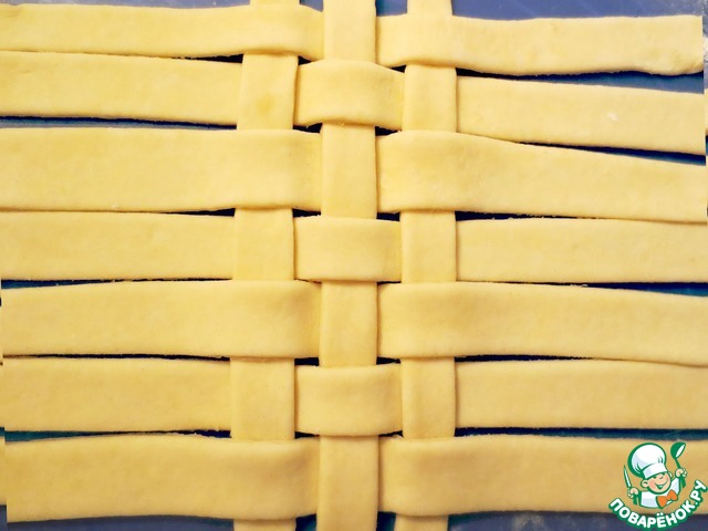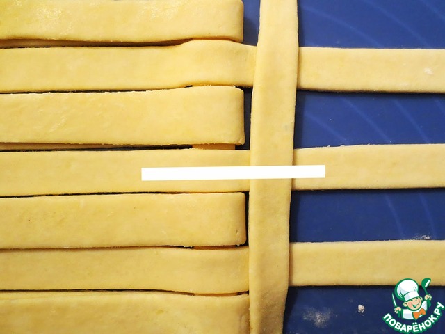 Затем одну полоску из теста положить перпендикулярно остальным. Первую полоску нужно положить в середину, там где идет сгиб.