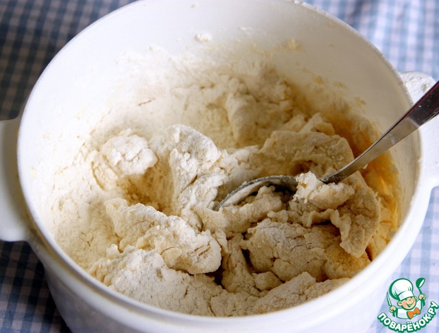 Добавить остальную муку и вымешивать тесто ложкой, а затем рукой, до однородности.