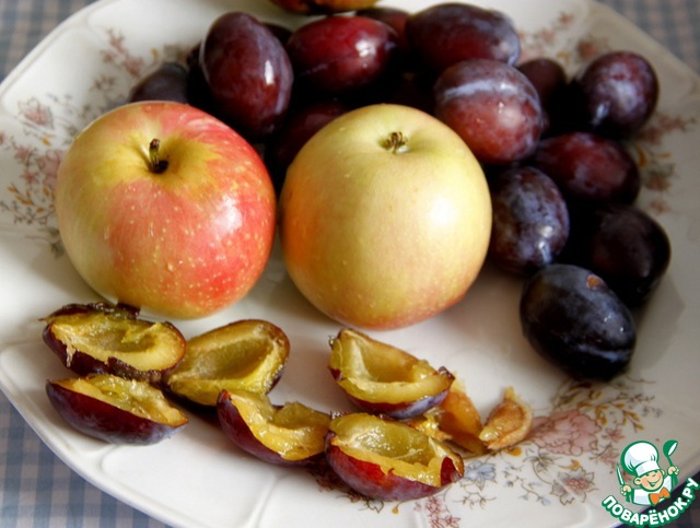 Сливу и яблоки помыть, обсушить от влаги. Сливу (лучше сорт - чернослив) разрезать пополам, удалив косточку.
