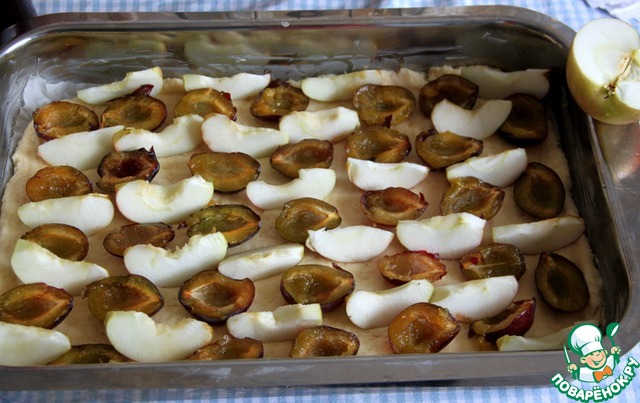 Яблоки разрезать пополам, удалить семенную коробочку и каждую половинку разрезать на 4-5 долек, которые выложить между сливой, также срезом вверх, слегка вдавливая в тесто.