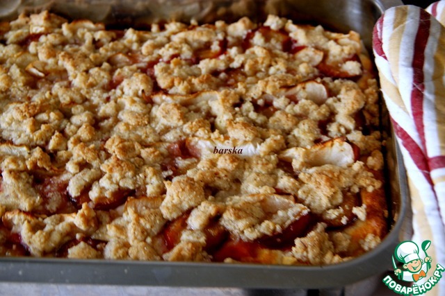 Распределить штрейзельную массу щепотками по пирогу, сверху по фруктам.