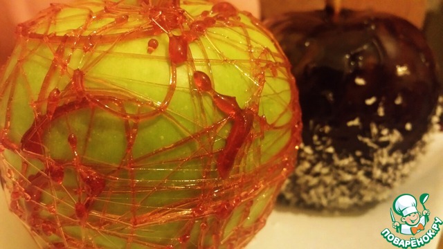 2) Дождаться пока карамель немного затвердеет. Делаем карамельные нити вокруг яблоки.