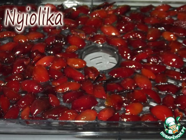 Разложить на поддоне электрической сушки. Сушить при температуре 55 градусов 4-5 раз по 3 часа. Слива становится пластичной, при нажатии жидкость не выделяется.