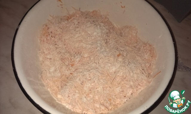 Вливаем содержимое в морковно-мучную смесь. Тщательно мешаем, лучше используя миксер.