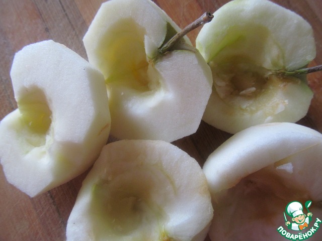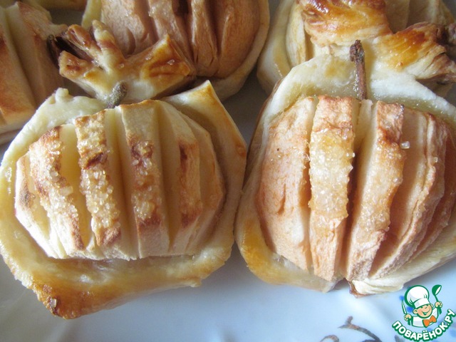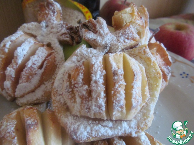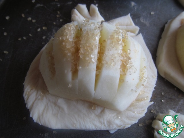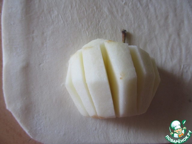 2. Раскатать тесто, порезать на квадратики и в каждый положить половинку яблока. Сделать на яблоке небольшие надрезы.