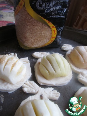 3. Вырезать тесто в форме яблока с листьями и посыпать в надрезы тростниковый сахар и корицу.