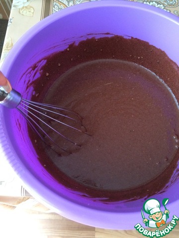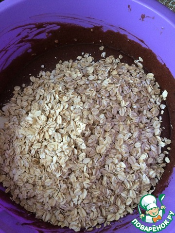 На первом этапе смешиваем все, кроме овсяной муки, хлопьев и орехов. Итак, яйца взбиваем с сахаром до пены. Маргарин или масло растапливаем до жидкого состояния в микроволновке (1-2 минуты, и лучше накрыть чем-то, иначе испачкается вся микроволновка). Пока маргарин растапливается, в стакан с закваской или кефиром всыпаем соду, перемешиваем и даем чуть настояться. Растопленный маргарин и кефир с содой вливаем к яйцам с сахаром, тщательно перемешиваем. Затем добавляем ванилин, какао-порошок, и соль с корицей по вкусу, перемешиваем.