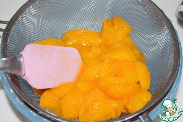 Абрикосы высыпать в кастрюлю, залить 100 мл воды и варить на маленьком огне до мягкости. Размягченные абрикосы протереть через сито.