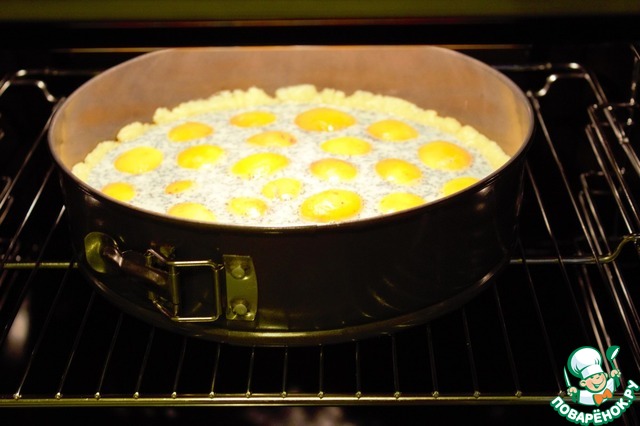 Тесто раскатать и выложить в форму, закрыв дно и бортики. Влить сметанную заливку, затем выложить абрикосы, немного утапливая их в заливке. Выпекать в предварительно разогретой духовке, при температуре 180 градусов 30-35 минут.