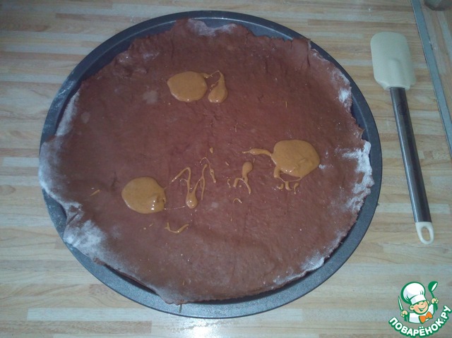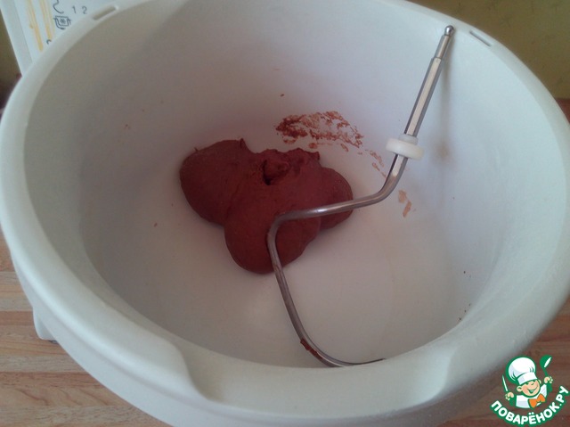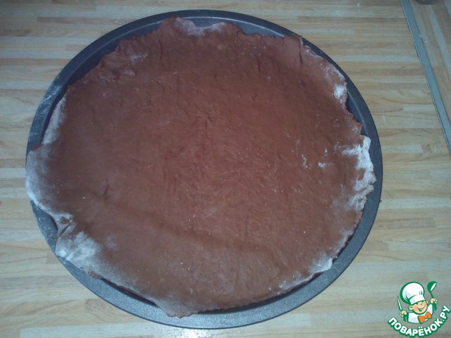 Из муки, какао, сахара, соли, масла и дрожжей замесить гладкое эластичное тесто. Можно это делать в хлебопечке на режиме "Пицца". Время программы около 1,5 ч. Поэтому я указала в пункте "время приготовления" 2 ч - это максимальное время с учетом подготовки теста.