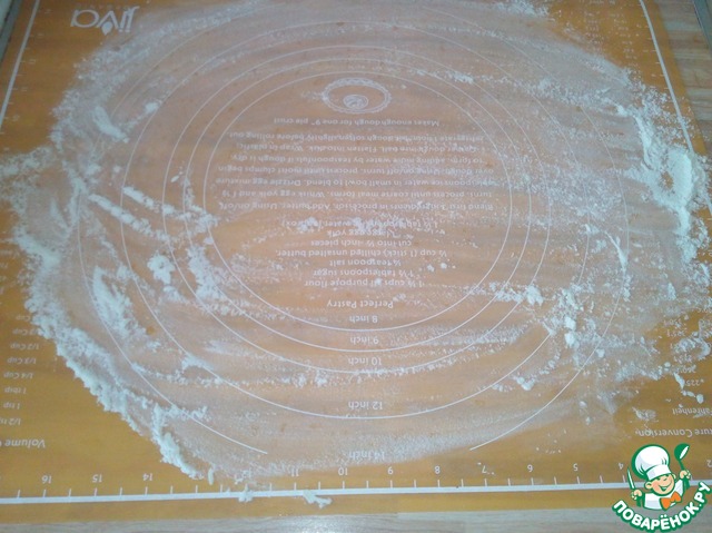 Подготовить рабочую поверхность для раскатки тонкого теста: немного подпылить ее мукой. Сразу оговорюсь, что из данного количества ингредиентов получается пицца диаметром примерно 32-34 см.