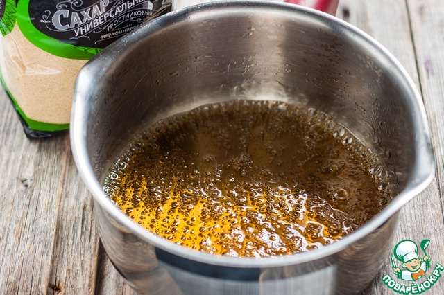 Поставить кастрюлю на огонь и уваривать, не перемешивая (!!!) до насыщенного карамельно-янтарного цвета и загустения, до мягкого, но плотного шарика. Здесь главное - не сжечь карамель, иначе соус будет немного горчить