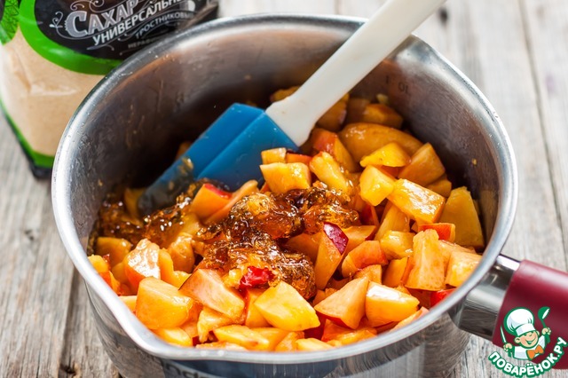 Всыпать нарезанные персики. Они зашипят, а карамель мгновенно схватится и затвердеет. Это нормально, так и должно быть. Варите еще 10 минут, немного перемешивая, персики пустят сок и карамель растворится. При желании в конце варки можно добавить немного лимонного сока