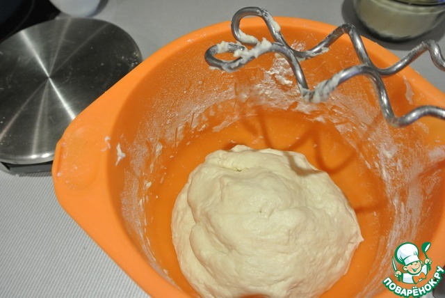 Добавить просеянную муку, замешать упругое тесто, если липнет к рукам, поставьте на 5-10 минут на холод.