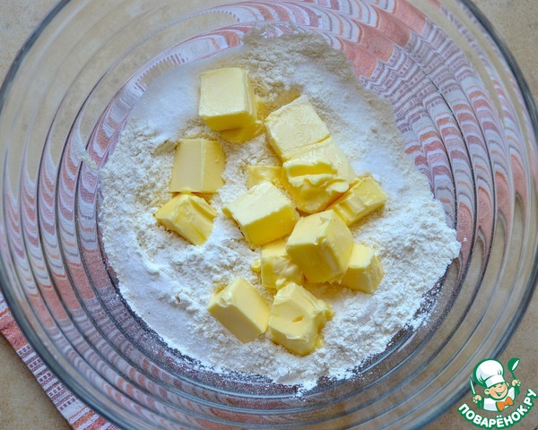 Просеять в миску муку, добавить сахар и кусочки размягченного масла. Перемешать руками до состояния мокрой крошки.