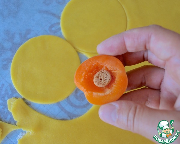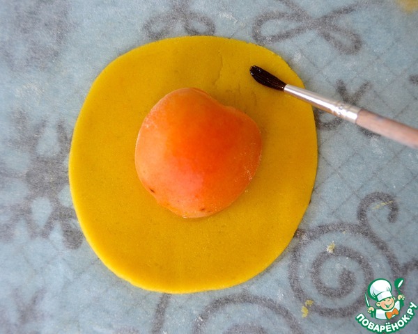 Положить половинку абрикоса на кружок из теста. С помощью кисточки смазать края диска яичным белком.