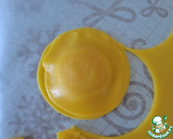 Выложить приготовленные таким образом все "равиоли" на противень, застеленный пекарской бумагой и смазать их белком. Выпекать в разогретой до 170°C духовке около 20 минут.