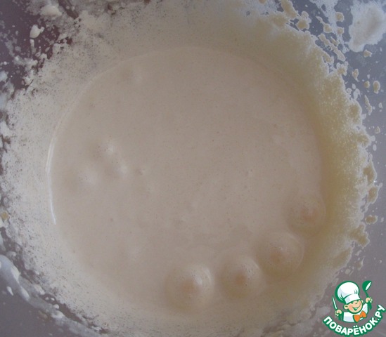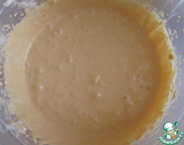 Желтки с сахаром взбить миксером до светлого кремового цвета.