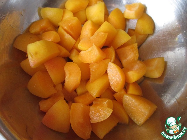 Теперь заливка. Абрикосы помыть, вынуть косточки. Порезать не мелко.
