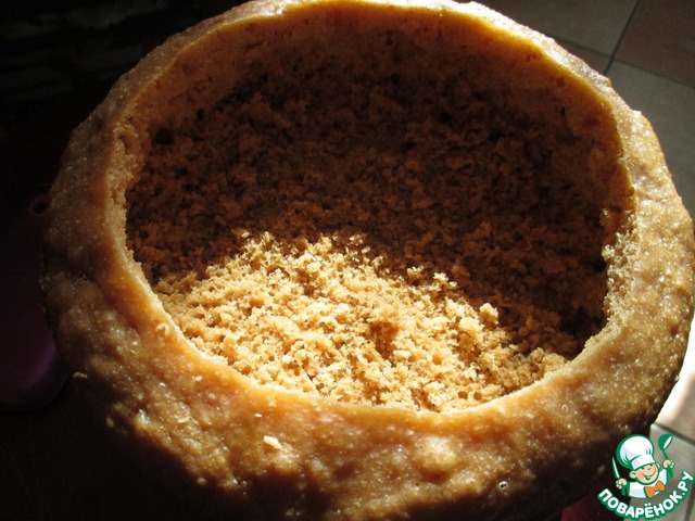 Отступая от края, вырезать у коржа середину. Вынуть мякиш, оставляя стенки и дно примерно толщиной 1 см.