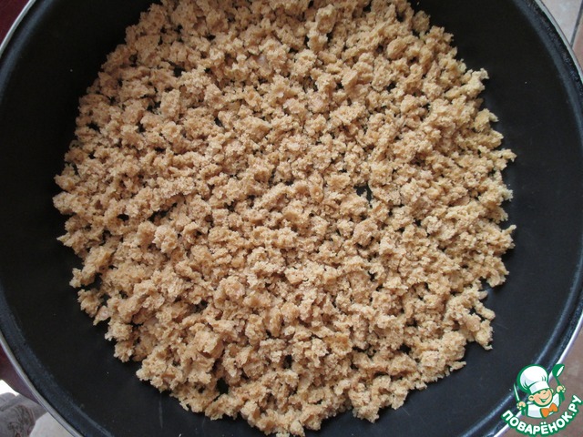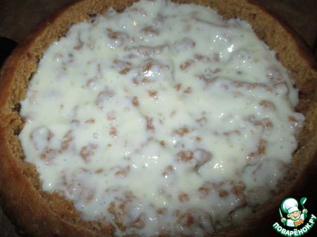 Теперь пудинговая начинка.. Приготовить пудинг, как указано на упаковке. Замочить листики желатина на 10 минут в холодной воде. Отжать их и добавить в горячий пудинг. Размешать хорошенько. В пудинговую массу всыпать высушенные крошки. Перемешать. Выложить в корж.