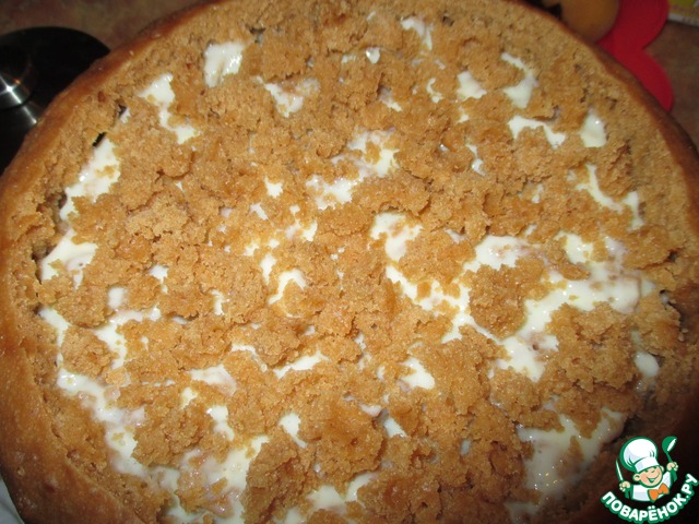 Теперь декор)Отложенные высушенные крошки надо растолочь мелко, любым удобным способом. Я положила их в пакетик и прошлась по ним многократно скалкой. Теперь смазываем бока торта тонким слоем варёной сгущёнки и обсыпаем этой самой крошкой. Всё! Торт готов. Теперь убираем его ( лучше на ночь) в холодильник, что бы он настоялся. А на следующий день можно уже его и отведать!