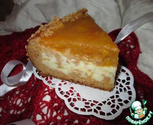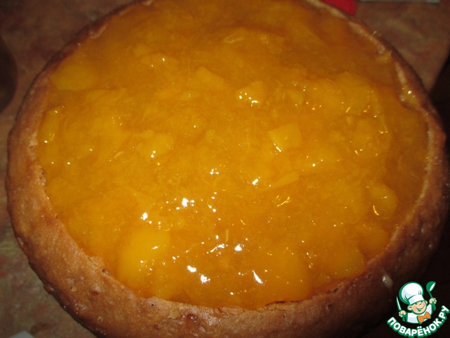 Теперь заливка. Абрикосовое пюре поставить на огонь, влить разведённые в 60 мл холодной воды 2 ст. л. крахмала. Размешать и варить на небольшом огне с момента кипения 5-7 минут, постоянно помешивая. Остудить.