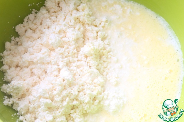 Добавляем творог, молоко и ванилин. Творог можно использовать любой.