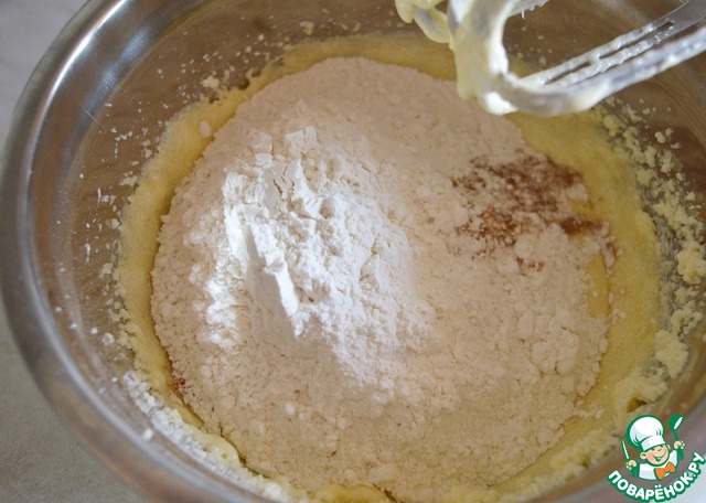 Затем добавляем муку с перетертыми пряностями, разрыхлителем, солью, корицей и мускатным орехом. Хорошо все перемешиваем миксером на низких оборотах.