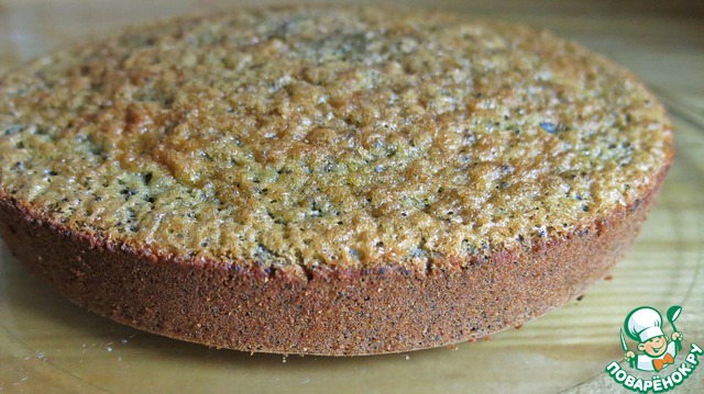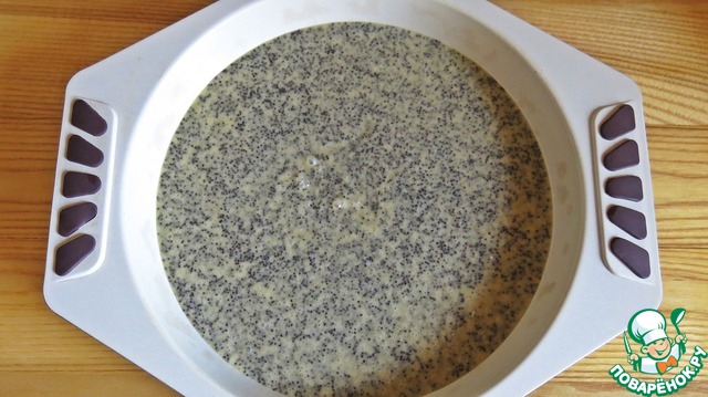 Затем, я "окольцевала" маковый корж разъемной формой, залила сверху желе и с чистой совестью убрала в холодильник на 2 ч. Но форма немного подвела меня и желе попало на боковые части. Вкус и внешний вид не пострадали, поэтому я на неё сильно не обиделась. :) А небольшие "разливы" желе внизу пирога, собрала ложечкой и положила на пирог сверху.