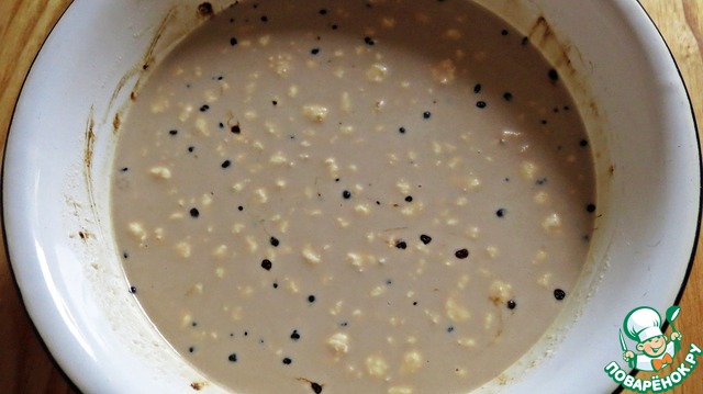 Затем, нагреваем желатин на маленьком огне или держим над огнем, постоянно помешиваем до полного его растворения. Снимаем с огня и соединяем с творожно-кофейной массой. Она будет выглядеть вот так. С крупинками кофе и творога. Убираем массу на 30 мин. в холодильник. Не больше!