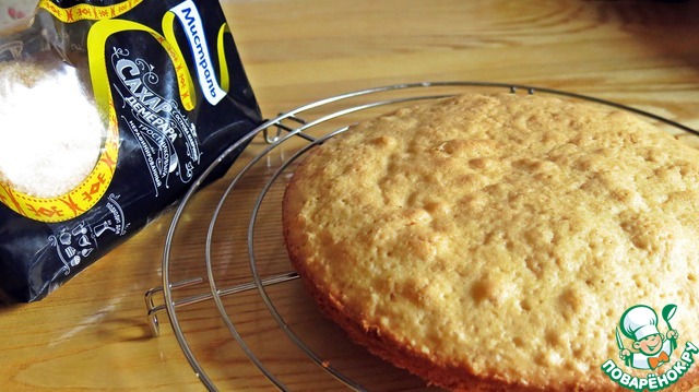 Наш бисквит уже давно готов. Его нужно достать из формы и дать ему остыть. У меня получился с небольшой горбинкой. При желании её можно срезать ножом, чтобы выровнять поверхность. Я этого делать не стала.