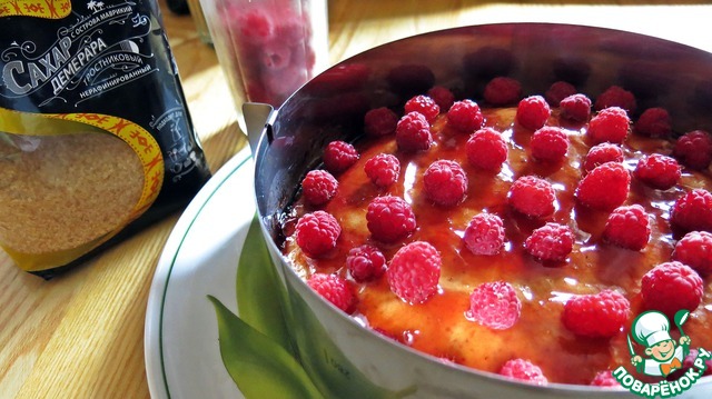 Остывший бисквит укладываем в разъемную форму, смазываем джемом и сверху на джем "приклеиваем" ягодки малины.