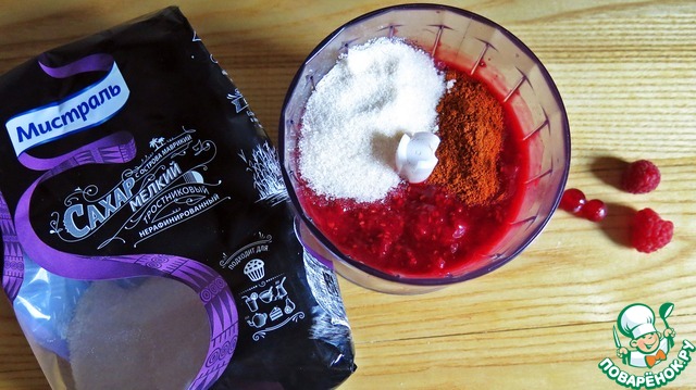 Удобнее начать с приготовления соуса. Малину и смородину нужно измельчить в пюре с помощью блендера. Добавить сахар и паприку. Снова перемешать. Я использую мелкий тростниковый сахар от ТМ "Мистраль" и для соуса, и для теста.